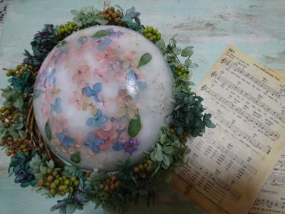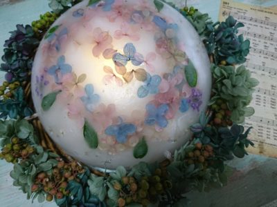 プリザーブドの紫陽花が映って優しい灯りです
