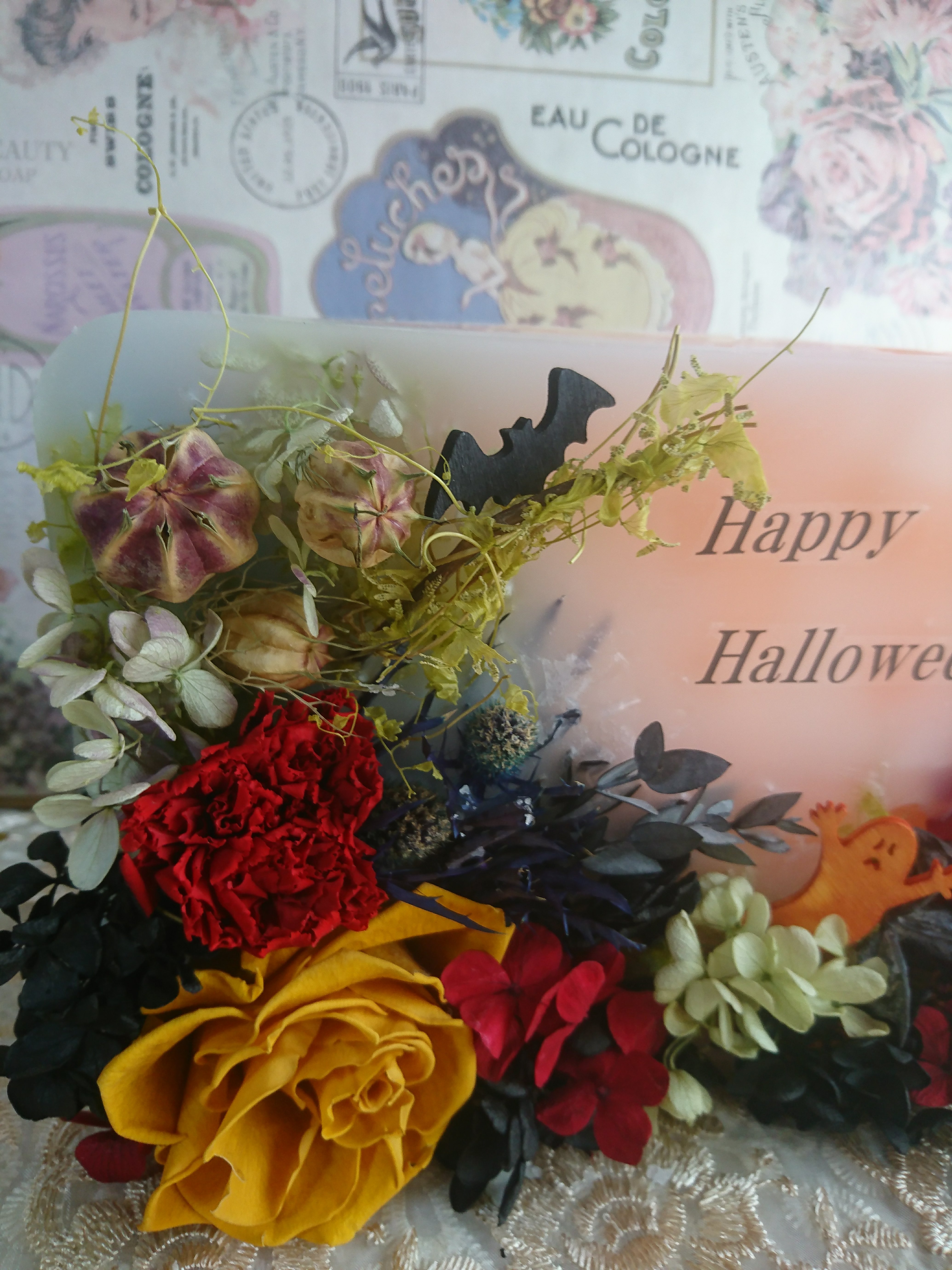大きな薔薇のプリザーブドフラワーはアンティークショップで見つけたものをお持ち込み頂きました。