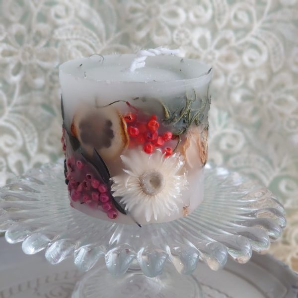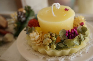 自然の恵み蜜蝋のキャンドルにドライフラワーをリース風に飾ったミニサイスのキャンドル。