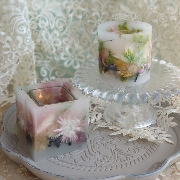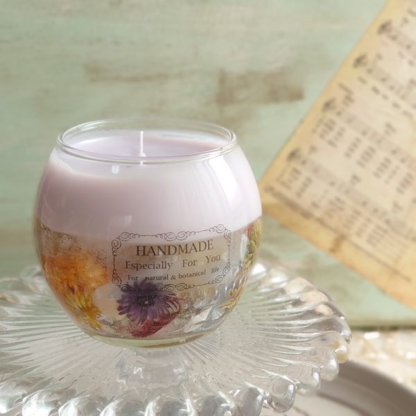 ドライフラワーを詰め込んだジェルキャンドルに、ソイワックスをMIXしたナチュラル感満載のキャンドル。優しい香りつきです。
