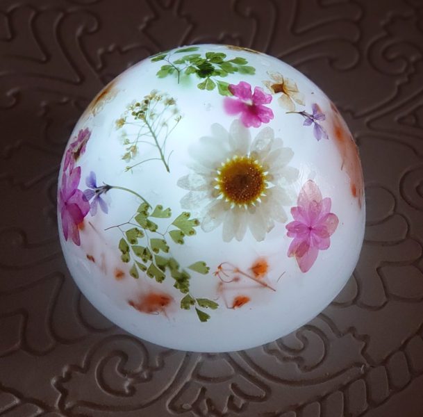 LEDライトが内蔵された安心安全な花灯ドームライト。ころんとまあるい手のひらサイズ。ライトを点灯すると押花が現像的に映ります。