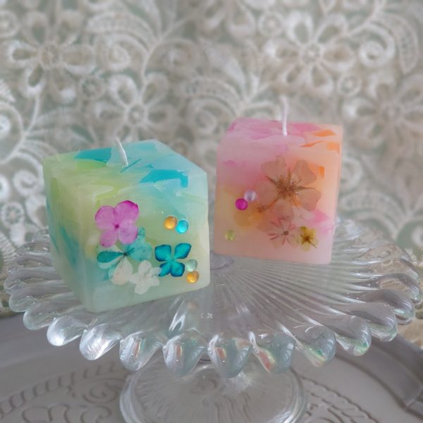 鮮やかな色の押し花のミニサイズのキャンドルを2個制作。お子様やキャンドル作りが初めての方にもオススメです。